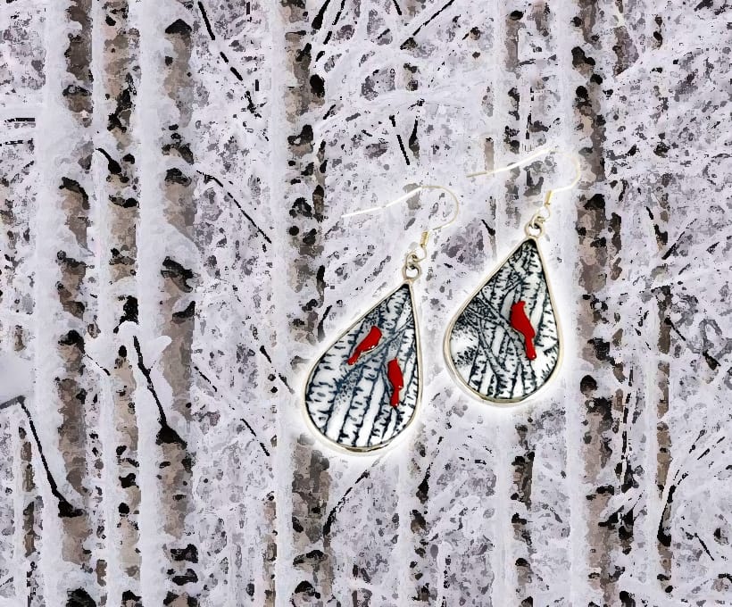“冬日恋曲”手绘珐琅耳饰,以水滴型不对称设计捕捉冬的奇幻与温暖,底面为白如雪的珐琅,用石墨勾画出如五线谱般流畅挺拔的白杨树干,向上延展直冲云霄。红色珐琅浮雕的鸟儿栖息于枝头,宛如跳跃的音符,为这片肃穆的冬景增添了生机与活力。红与黑的经典搭配交织出冷冽与温暖的情感,为耳饰赋予独特生命力,若一封承载着冬日记忆的信笺。